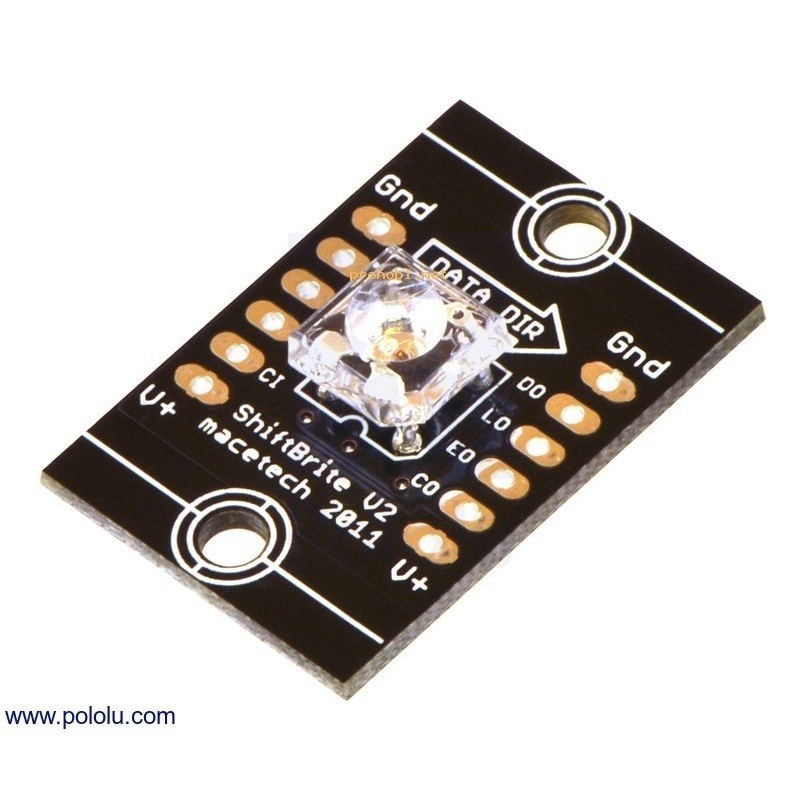 The ShiftBrite V2.0 is an RGB LED module with a built-in driver featuring 10-bit digital brightness control on each color channel (over one billion colors). Multiple modules can easily be chained together and controlled from a single microcontroller to create large LED displays. This version has several improvements over the original ShiftBrite, including mounting holes and better power handling. This configuration comes with no header pins.
