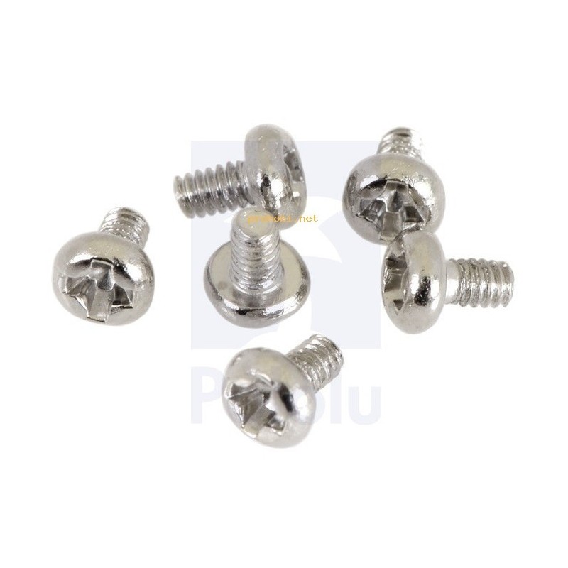 These M1.6, pan-head screws are 3 mm long. They are made from zinc-plated steel and ship in packs of 6. These screws, which can be difficult to find, work with the mounting holes on the brass face plates of micro metal gearmotors.