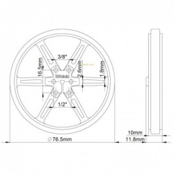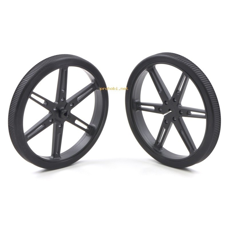 These black plastic wheels press-fit onto the 3mm D shafts on many of our motors, including our micro metal gearmotors and our plastic gearmotors with 3mm D-shafts, to make a nice drive solution for small robots. The wheels have silicone tires and measure 80 mm (2.36″) in diameter. Two additional mounting holes for 4-40 screws make it possible to use the wheel with several of our universal mounting hubs. The wheels are sold in pairs.