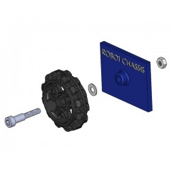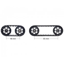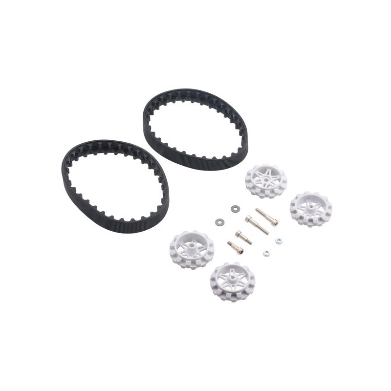 This track set includes a pair of 30-tooth silicone tracks, two drive sprockets measuring 1.38 (35 mm) in diameter, and two matching idler sprockets along with mounting hardware. The drive sprockets are designed to work with 3mm D-shafts, such as those on our micro metal gearmotors and 15.5D mm metal gearmotors.