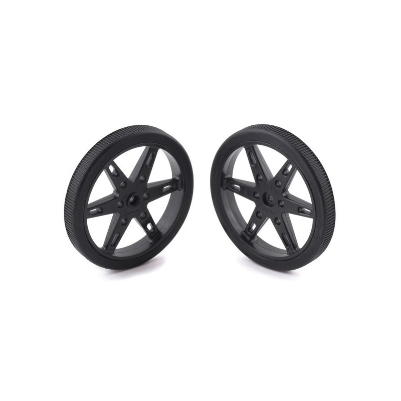 These black plastic wheels have silicone tires and measure 60 mm (2.36″) in diameter. They mount onto micro servo splines with 20 teeth and a 4.8 mm diameter.