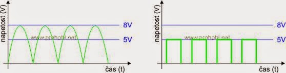 Spodnja slika prikazuje namen, ki ga pričakujemo od regulatorja: rdeča je nestabilizirana in neregulirana napetost na vhodu regulatorja, izhod pa prikazuje desna stran.