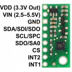 Vezje ima že vgrajen 3,3V napetostni regulator in pretvornik nivoja, ki omogoča delovanje v napetostnem območju od 2,5V do 5,5V. Senzor ponuja I2C in SPI vmesnika.